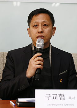 | ▲공대위 측 구교형 목사(교회개혁실천연대 집행위원장)가 발언하고 있다. ⓒ사진=지유석 기자 |