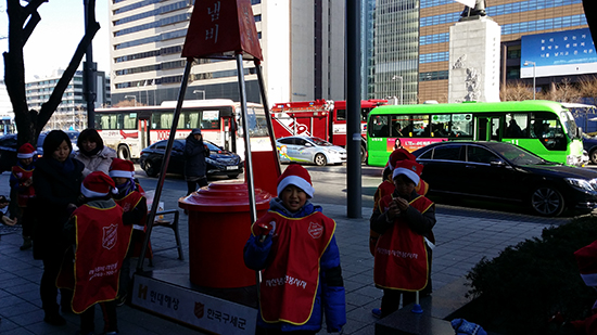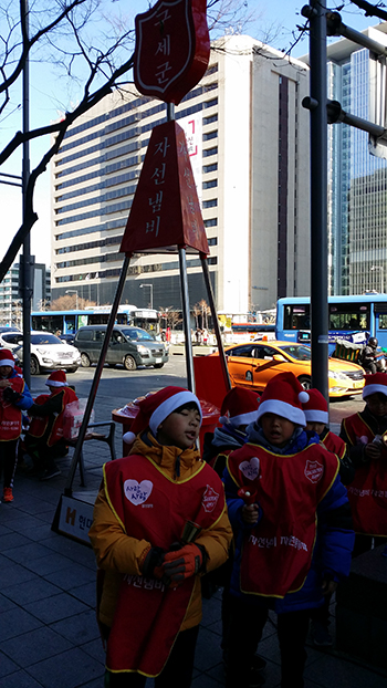 12월18일(목) 광화문 네거리에 찬바람이 몰아치는 영하의 날씨에도 불구하고 어린이 구세군들이 거리로 나서 모금 운동을 벌이고 있다.