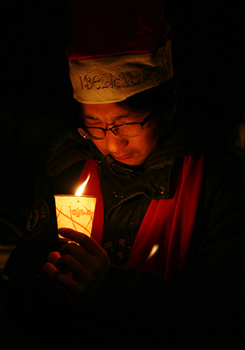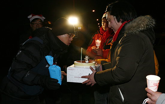 | ▲‘고난함께’가 24일(수) 경기도 평택 쌍용차를 찾아 ‘고난 받는 이들과 함께하는 새벽송’을 진행한 가운데 김득중 쌍용차 지부장이 선물로 받은 케잌의 촛불을 끄고 있다. ⓒ사진=지유석 기자 |