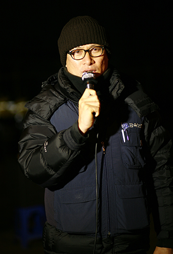 | ▲‘고난함께’가 24일(수) 경기도 평택 쌍용차를 찾아 ‘고난 받는 이들과 함께하는 새벽송’을 진행한 가운데 김득중 쌍용차 지부장이 답사를 하고 있다. ⓒ사진=지유석 기자 |