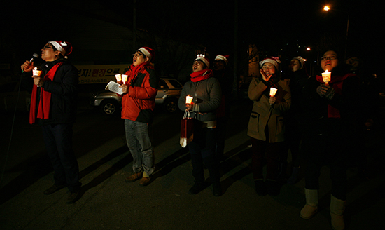 기독교 사회선교 기관인 ‘고난함께’가 24일(수) ‘고난 받는 이들과 함께하는 새벽송’을 진행한 가운데 첫 방문지로 두 명의 노동자가 고공 농성 중인 평택 쌍용차를 찾아 새벽송을 진행했다.