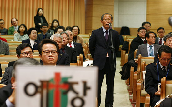 | ▲지난 11월24일(월) 서울 강서구 화곡동 강남교회에서 열린 NCCK 제63회 총회에서 예장통합 정영택 총회장이 회의장 철수를 선언하고 있는 모습. ⓒ사진=지유석 기자 |
