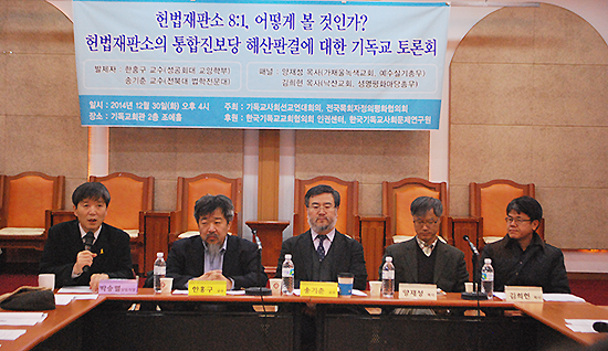전국목회자정의평화협의회(상임의장 박승렬 목사)는 기독교사회선교연대회의와 공동으로 헌법재판소(헌재)의 통합진보당 해산판결에 대한 기독교 토론회 “헌법재판소 8:1, 어떻게 볼 것인가?”를 12월30일(화) 오후 기독교회관 조에홀에서 개최했다. 이 날 성공회대 한홍구 교수가 “민주화로 태어난 헌재, 기득권 수호 첨병으로”를, 전북대 송기춘 교수가 “피음사둔(詖淫邪遁)의 통합진보당 해산결정문”을 발제했다.