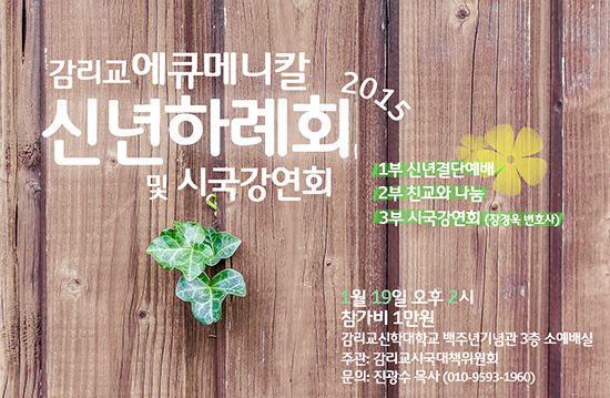 감리교시국대책위원회(이하 대책위)는 오는 1월19일(월) 오후 서울 서대문 감리교신학대학교 백주년기념관에서 ‘감리교 에큐메니칼 2015 신년하례회’(이하 신년하례회)를 주관한다.