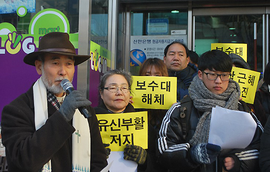 1월8일(목) 기독교회관 앞에서 열린 <공안탄압 규탄 농성돌입 긴급기자회견>이 열린 자리에서 예수살기 공동대표인 조헌정 향린교회 목사가 연대발언을 하고 있다. 우연히 조 목사의 옆에 서 있게 된 앳된 얼굴의 청년은 한국교회의 진보적 사회운동의 연속성을 증명하고 있는 듯하다.