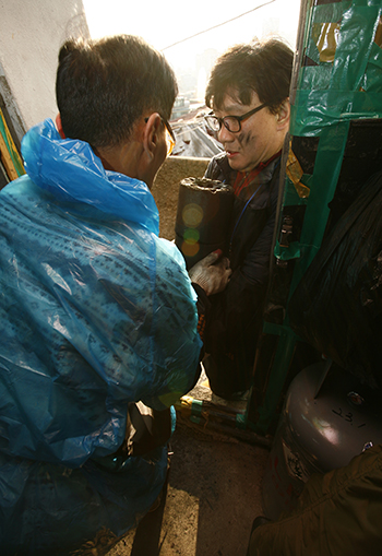 | ▲<광화문 연가> 그룹장 지승룡 민들레영토 대표와 회원 40명은 사단법인 <따뜻한 한반도 사랑의 연탄나눔운동>(원기준 사무총장, 이하 나눔운동)과 함께 1월9일(금) 오후 서울 성북구 돈암동 일대 독거노인들에게 연탄 배달 봉사활동을 벌였다. ⓒ사진=지유석 기자 |