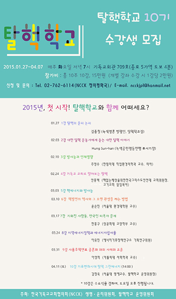 한국기독교교회협의회(NCCK) 생명윤리위원회에서는 ‘탈핵학교’ 10기 수강생을 모집한다.