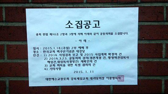 | ▲대한예수교장로회 강북제일교회 대리당회장 이광형 목사 명의로 미아동 강북제일교회 벽에 붙은 공동의회 소집공고문. ⓒ사진제공= 강북제일교회 |