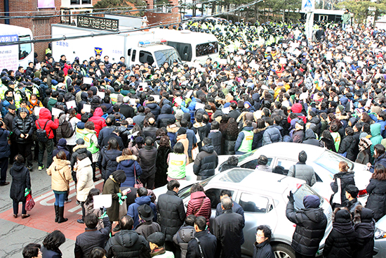 | ▲강북제일교회 황형택 목사 측 교인들이 공동의회 장소인 서울 종로구 연지동 한국교회100주년기념관 앞에 운집해 있다. ⓒ사진제공=강북제일교회 |