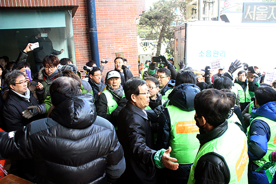 | ▲강북제일교회 황형택 목사 측 교인들이 19일 공동의회 장소로 진입을 시도하자 조인서 목사 측이 이를 막아서고 있다. ⓒ사진제공=강북제일교회 |