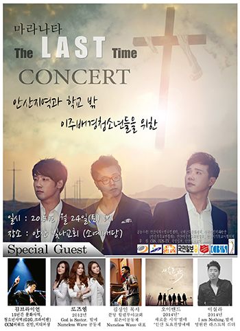 콘서트에는 활동 6년만에 “마라나타, The LAST Time” 1집 앨범을 발표하는 남성 3인조 보컬그룹 ‘라스트’와 특별게스트로 ‘김브라이언,’ ‘로즈엠,’ ‘오이밴드,’ ‘이실라’가 출연하며, 분당 할렐루야교회의 청년사역자 김상인 목사가 말씀을 전한다.
