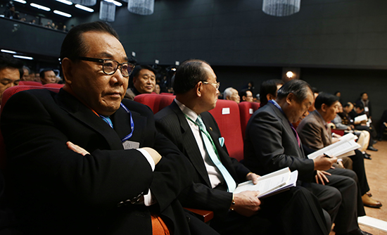 | ▲제26회 한기총 정기총회에 참석한 주요 인사들. 사진 왼쪽은 예장합동의 총회결의 이행 등을 놓고, 총신대 총장 거취 문제로 곤욕을 치르고 있는 길자연 목사(왕성교회 원로). ⓒ사진=지유석 기자 |