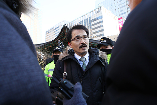 | ▲광화문 광장 철거 최후통첩을 전하기 위해 1월27일(화) 오후 서울 광화문광장을 찾은 정함철 씨가 기자들의 질문에 답하고 있다. ⓒ사진=지유석 기자 |