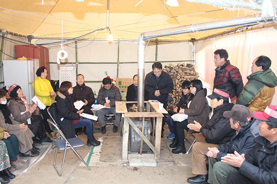 | ▲핵그련 회원들은 월성원전 홍보관 앞에 있는 <월성원전 인접주민 이주대책위원회>(이하 이주대책위) 농성천막을 방문하여, 월성1호기의 폐쇄 및 생존권을 요구하는 나아리와 나산리 주민들을 만나 간담회를 진행했다. ⓒ사진제공=NCCK |