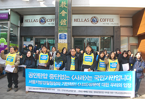 <예배당 침탈, 평화운동탄압 저지를 위한 기독교공동대책위원회>(이하 공대위)는 2월2일(월) 오전 종로구 연지동 기독교회관 앞에서 “공안탄압 중단 없는 사과는 거짓입니다!”는 제하의 기자회견을 열고 서울지방경찰청장의 ‘사과’ 방문을 기만적 행위라고 비판하는 입장을 밝혔다.