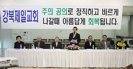 | ▲강북제일교회 황형택 목사 측이 6일 미아동 소재 강북제일교회에서 기자회견을 열었다. ⓒ사진=이인기 기자 |