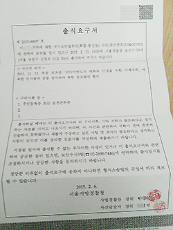 | ▲이적 목사가 제시한 경찰의 출석요구서. |