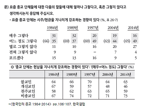 갤럽의 조사결과 “종교의 사회적 영향력이 증가하고 있다”는 의견이 1984년 68%에서 2014년 47%로 21% 감소한 것으로 나타났다. 또 “종교단체가 종교 본래의 뜻을 잃어버리고 있다”는 데 동의하는 응답은 1997년 72%로 정점을 기록했지만 이후 2004년 68%, 2014년 63%로 감소해 다시 30년 전(1984년 67%)과 비슷해진 것으로 조사됐다. 이에 비해 “그렇지 않다”는 의견은 1984년 20%에서 2014년 33%로 증가했다. 특히 비종교인 가운데 71%가 종교의 본질에 회의적인 것으로 집계돼 대체로 종교인보다 비종교인이 종교단체에 대해 좀 더 비판적 입장이었다.