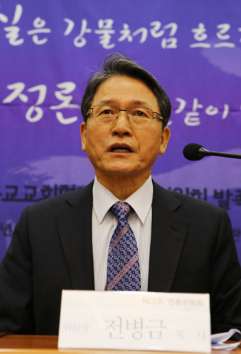 | ▲NCCK 언론위원회 위원장 전병금 목사(강남교회)가 11일 오전 서울 연지동 기독교회관 2층에서 열린 기자회견에서 발언하고 있다. ⓒ사진=지유석 기자 |