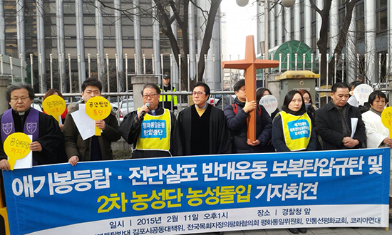 민주주의수호와 공안탄압저지를 위한 피해자농성단(단장 이적 목사)은 한국기독교회관에서 35일차 농성을 진행하는 한편, 현 정권의 공안탄압을 규탄하는 기자회견을 2월11일(수) 오후 1시 경찰청 앞에서 거행했다. 기자회견은 지난해 12월 22일 애기봉등탑반대운동에 앞장섰던 이적 목사와 코리아연대 회원들에 대한 압수수색과 현재 김포시민사회단체 회원들에 대해 소환장이 발부되는 상황을 무차별적인 보복탄압으로 규정하고 규탄했다.