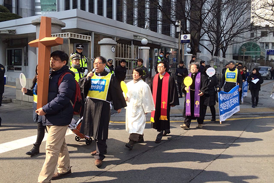 | ▲민주주의수호와 공안탄압저지를 위한 피해자농성단(단장 이적 목사)은 한국기독교회관에서 35일차 농성을 진행하는 한편, 현 정권의 공안탄압을 규탄하는 기자회견을 2월11일(수) 오후 1시 경찰청 앞에서 거행했다. ⓒ사진=베리타스 |