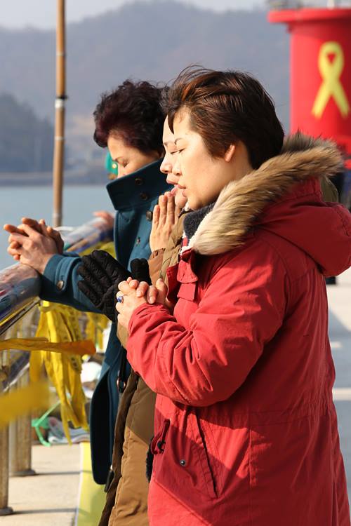 | ▲14일(토) 팽목항을 찾은 도보순례단 중 일부가 간절히 기도를 하고 있다. ⓒ사진=지유석 기자 |