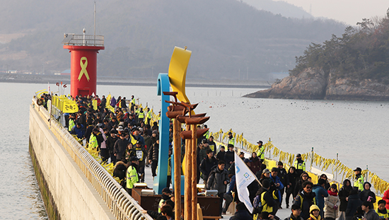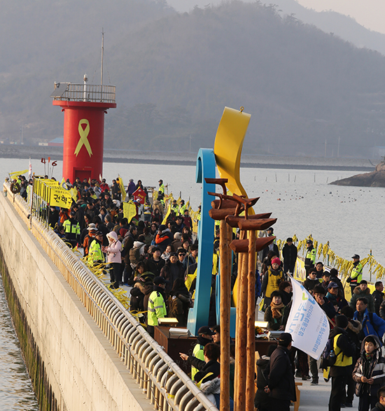 세월호 참사 발생 305일째인 2월14일(토), 진도 팽목항은 모처럼 인파로 넘쳐났다. 마침 이날은 세월호 인양 및 참사 진상규명을 호소하기 위해 경기도 안산을 출발한 ‘세월호 가족 안산~팽목항 도보행진단’(이하 행진단)이 팽목항으로 들어오는 날이기도 했다. 이날 행진엔 세월호 유가족 및 시민 사회단체, 종교인 등 2,000여 명이 참가했다.