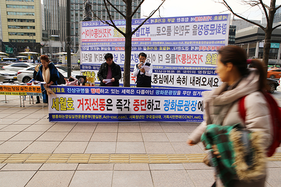 한편 운동본부는 세월호 천막농성장 바로 맞은편에 “광화문 광장을 국민 품으로,” “세월호 거짓선동가들은 더 이상 희생자들의 넋을 욕되게 말라”는 등의 문구가 적힌 현수막을 내걸고 행인들을 대상으로 서명운동을 벌였다. 60, 70대로 보이는 노년층 몇몇은 호의적인 반응을 보이기도 했다. 그러나 시민들 대부분은 이들의 구호를 외면한 채 현장을 지나쳤다. 한 시민은 기자회견 중인 정 씨를 향해 “시끄럽다”고 외치기도 했다.