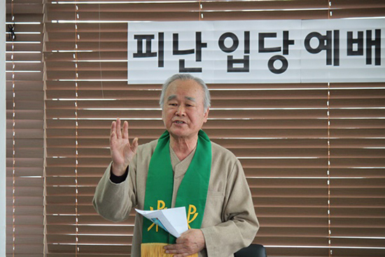 | ▲민통선평화교회(담임 이적 목사)는 시국농성단과 함께 2월26일(목) 오후 종로구 연지동 기독교회관 709호에서 공안탄압저지 피난예배당 입당예배를 올렸다. ⓒ사진제공=민통선평화교회이전 추진위원회 |