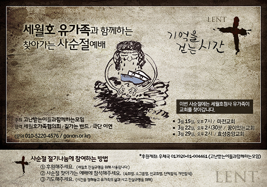 기독교 사회선교기관인 <고난 받는 이들과 함께하는 모임>(이사장 신경하 감독, 이하 고난함께)는 사순절을 맞아 <세월호 참사 유가족과 함께하는 찾아가는 사순절 예배 — 기억을 걷는 시간>을 진행한다. 이번 예배는 특별히 유가족이 직접 교회를 찾아가 예배를 드리는 방식으로 열릴 예정이다. 고난함께 측은 “예배를 위해 세월호가족협의회에서 유가족들이 적극적으로 동참할 것이다. 세월호 참사에 대한 편견을 내려놓고 더욱 예배에 집중할 수 있도록 ‘길가는 밴드’와 ‘극단 이연’도 함께 한다”고 밝혔다.