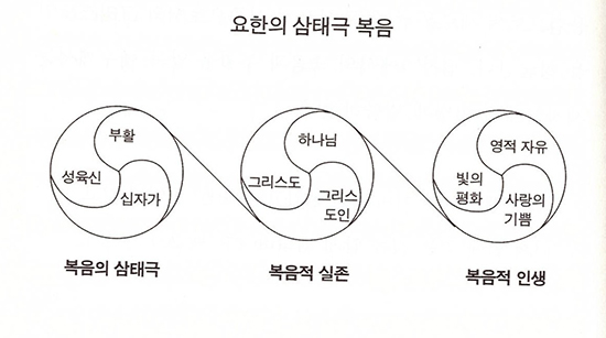 | ▲유동식 교수의 저서 『제3시대와 요한복음』 (동연, 2014) 28쪽에 나오는 '요한의 삼태극 복음' 도해 자료. |