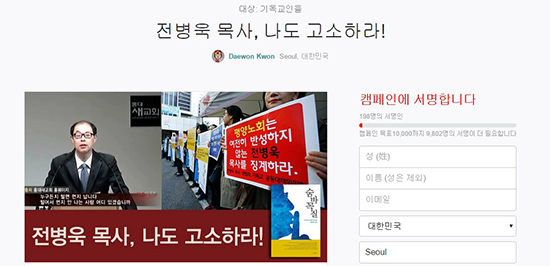 | ▲전 목사 측으로부터 고발 당한 피고발인단은 9일(월) 오후 ‘나도 고소하라’ 캠페인을 시작했다. 1만 명 서명을 목표로 진행되는 ‘나도 고소하라’ 캠페인에 9일 오후 4시 현재 198명이 서명했다. ⓒ캠페인 화면 갈무리 |