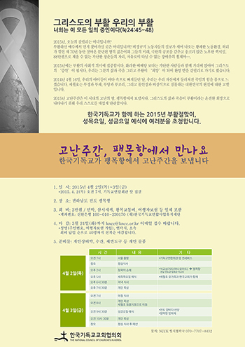 한국기독교교회협의회(NCCK)가 고난주간을 팽목항에서 보내자고 초청했다. NCCK 관계자는 “2015년 고난주간은 이 시대의 고난의 땅, 팽목항에서 보냅시다. 그리스도의 삶과 죽음이 부활이라는 온전한 희망으로 나타나기 위해 우리 스스로를 매섭게 단련합시다”며 초청의 말을 전했다.