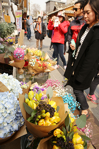주 초반 맹위를 떨치던 꽃샘추위가 물러가고 봄기운이 완연한 가운데 3월15일(일) 오후 서울 삼청동에 나들이 나온 시민들이 갖가지 빛깔의 봄꽃을 즐기고 있다. 이날 서울 한낮기온은 예년보다 3도 높은 13도를 기록했다.