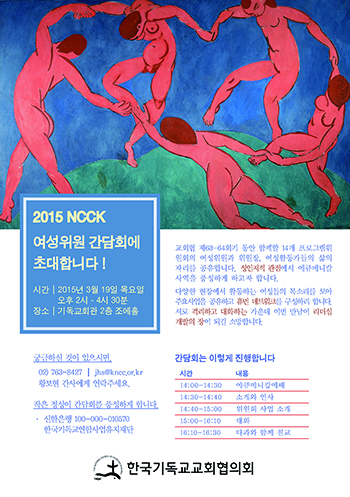 한국기독교교회협의회(NCCK) 여성위원회(위원장 성영자 목사)는 오는 3월19일(목) 오후 서울 종로구 연지동 한국기독교회관 2층 조에홀에서 제63-64회기(2015~2016년)에 활동하는 14개 프로그램위원회의 여성위원과 위원장들을 초청해 <2015 교회협 전체여성위원 간담회>를 개최한다.