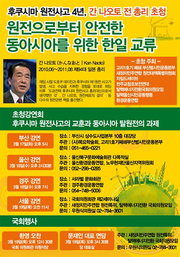 초청단체들은 노후원전에 대한 대책을 고심하고 있거나 원전 밀집지역 인근에 사는 대도시 시민들에게 간 나오토 총리의 원전 사고 경험과 원전 제로 사회의 전망을 공유할 수 있는 기회가 될 것이라고 기대하고 있다.