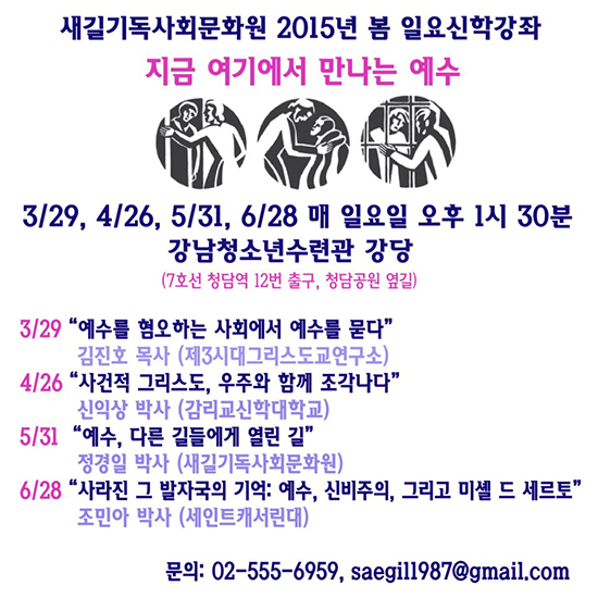 새길기독사회문화원(원장 정경일 박사)은 오는 3월29일(일)부터 오는 6월28일(일)까지 4차례에 걸쳐 <2015년 봄 일요신학강좌 - 지금 여기에서 만나는 예수>를 진행한다.