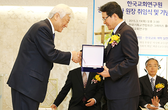 | ▲19일 한국교회연구원 신임원장 취임식에서 김영주 NCCK 총무(좌)가 전병금 신임원장(우)에게 취임패를 전달하고 있다. ⓒ사진=지유석 기자 |