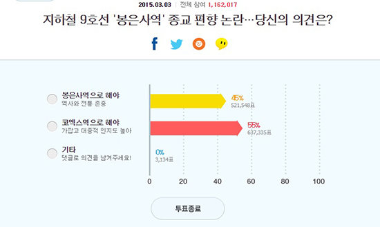 한교연과 언론회의 주장에서 눈에 띠는 점은 공통적으로 ‘서울시민들의 반대’를 명분으로 내세웠다는 점이다. 지난 3월3일(화) 검색포털 네이트는 <지하철 9호선 ‘봉은사역’ 종교 편향 논란, 당신의 의견은?>을 주제로 온라인 투표를 실시했다. 총 1,162,017명이 참가한 투표에서 ‘코엑스역으로 해야 한다’는 의견이 55%(637,335표), ‘봉은사역으로 해야 한다’는 의견이 45%(521,548표)를 기록했다. 한교연이 법원에 제출한 가처분신청엔 해당 설문조사 결과가 반영돼 있었다.
