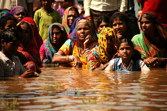 | ▲인도 마드야 프라데쉬 주의 시민들이 “잘 사티야그라하”(간디의 비폭력저항운동을 따라 물의 정의를 위해 투쟁하는 운동)에 참가하여 수위가 높아가는 댐의 물속에 스스로 몸을 담그고 있다. ⓒ사진제공= Pallav Thudgar |