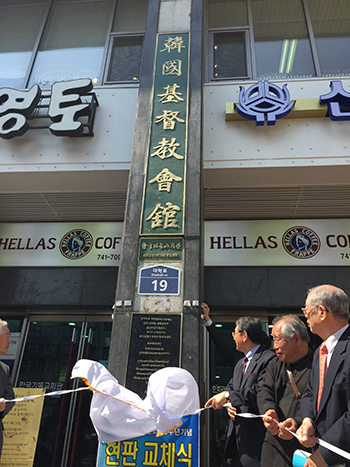 ▲현판교체식을 갖는 NCCK 인권센터 관계자들. ⓒ사진=지유석 기자