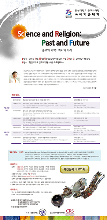 한신대학교(총장 채수일)가 올해로 개교 75주년을 맞는 가운데 한신대학교 종교와과학센터(CRS, 센터장 전철)에서 ‘종교와 과학 국제학술대회’를 개최한다. 학술대회의 주제는 “종교와 과학: 과거와 미래”이며 오는 4월28일(화)과 29일(수) 양일간 서울 수유동 신학대학원에서 열린다.