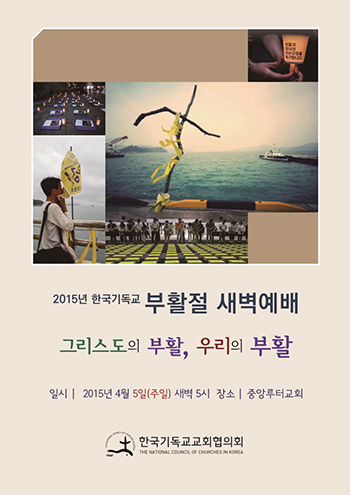 한국기독교교회협의회(NCCK, 총무 김영주 목사)는 한국기독교 부활절 새벽예배를 4월5일 오전 5시 용산구 후암동 중앙루터교회에서 봉헌한다. 이번 부활절 예배의 주제는 “그리스도의 부활, 우리의 부활”이며, 이 주제에 따라 1)한국교회 갱신 운동으로서의 교회일치 운동 2)사회적 요구에 답함으로써 그리스도의 복음을 증거함 3)한반도 평화·비정규직·세월호 참사 등에 대한 대책 마련 등을 위해 기도하고 결의할 예정이다.