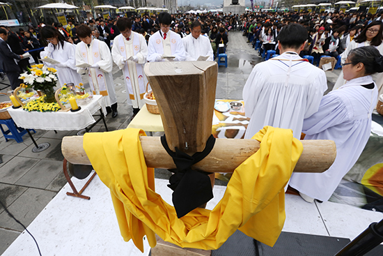 ‘고난 받는 이들과 함께 하는 부활절연합예배 준비위원회’(위원장 장병기 기독교사회선교연대회의 상임대표)는 부활절인 4월5일(일) 오후 서울 광화문 광장에서 <2015년 연합예배>(이하 연합예배)를 봉헌했다. 세월호 참사 1주기를 맞아 “곁에 머물다”를 주제로 드려진 이번 연합예배엔 故 유예은 학생의 어머니 박은희 씨와 실종자 허다윤 학생의 어머니 박은미 씨 등 세월호 유가족 및 실종자 가족들도 함께 했다.