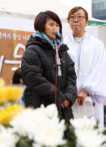 설교에 이어진 중보기도 순서에서 故 유예은 학생의 어머니인 박은희 씨가 단상에 올랐다. 박 씨는 쌍용자동차‧콜트콜텍‧스타케미컬‧LG유플러스‧SK브로드밴드 등 부당해고나 간접고용으로 인해 고통당하는 노동자들을 위해 “이 땅에 비정규직이란 낙인이 사라지게 하시고, 이들을 벼랑으로 내모는 모든 불의한 법이 사라지게 하시고, 노동조합의 소중한 권리가 지켜지게 하옵소서”하고 기도했다. 한편 실종자 허다윤 학생의 어머니 박은미 씨는 흐느끼며 “이제 잔인한 4월을 맞고 있다. 실종자 가족들은 아직 2014년 4월16일을 살아가고 있다. 저희가 엄마고 아빠인데, 할 수 있는 건 피켓 들고 거리로 나와 아이들을 찾아 달라는 것밖엔 할 수가 없다”고 했다. 그러면서 “딸 다윤이는 가정예배 때마다 엄마 아프지 않게 해달라고 기도했던 아이였다. 실종자 가족들은 하루하루 피가 마르고 있다. 다윤이가 돌아올 때까지, 그리고 실종자 가족이 아니라 유가족이 될 수 있도록 함께 기도해 달라”고 당부했다.