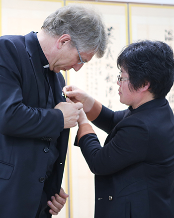 | ▲8일(목) 서울 강북구 인수봉로 한신대학교에서 울라프 트베이트 WCC 총무와 세월호 참사 유가족 및 실종자 가족 간담회가 열린 가운데 실종자 가족인 이금희 씨가 트베이트 총무에게 노란 리본을 달아주고 있다. ⓒ사진=지유석 기자 |