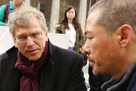 | ▲울라프 트베이트 WCC 총무가 8일(수) 오후 서울 광화문 광장을 찾아 노숙 농성 중인 ‘유민아빠’ 김영오 씨를 위로했다. ⓒ사진=지유석 기자 |