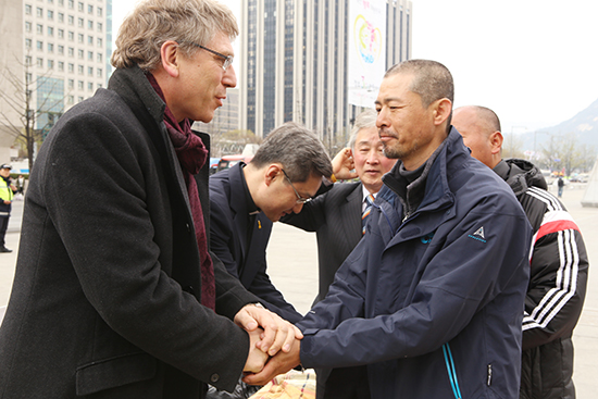 | ▲울라프 트베이트 WCC 총무가 8일(수) 오후 서울 광화문 광장을 찾아 노숙 농성 중인 ‘유민아빠’ 김영오 씨를 위로했다. ⓒ사진=지유석 기자 |