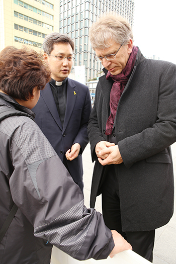 울라프 트베이트 세계교회협의회(WCC) 총무가 4월8일(수) 오후 서울 광화문 광장을 찾아 세월호 참사 유가족 및 실종자 가족들을 만나 위로의 메시지를 건넸다.