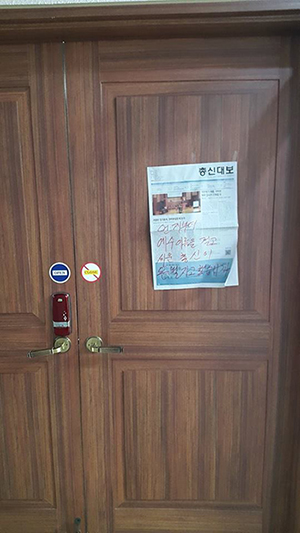 | ▲총신대가 모금을 이유로 채플을 외부 목회자에게 맡기기로 하자 이 학교 학생들이 학내 게시판과 외벽, 심지어 총장실 등 곳곳에 “언제부터 예수 이름을 걸고 세운 총신이 돈 벌자고 했습니까”라고 적힌 대자보를 붙이며 강력히 반발했다.(사진은 총장실에 붙여진 대자보) |